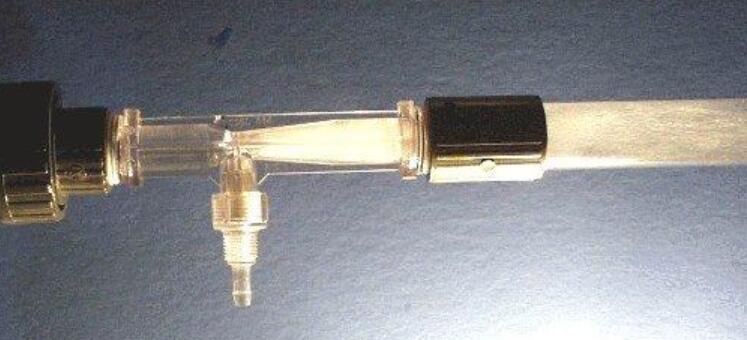 空氣被吸入文丘里管/注射器 - 注意吸入口后存在的數(shù)千個(gè)小氣泡。