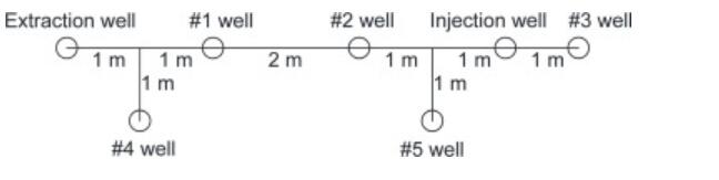 一臺抽采井,一臺注入井和五個監控井(其位置如圖2所示)用于原位修復。 很初的地下水流向是從注入井到提取井。每個井的深度為16  m,篩選間隔為12  m至16  m。提取井的直徑為25  cm,將提取速率為36  L / min 的泵放置在井內15  m 的深度處。注入井和監測井的直徑為5  厘米。注入井與注入單元相連,注入率為15 升/分鐘 由于注入速率受場地和設施條件的限制,因此采用了較高的抽取速率以產生更強的地下水流。處理殘留的水并將其排放到遠離測試區域的地方。在監測井中安裝了地下水采樣器,以收集15  m 深度的樣品。