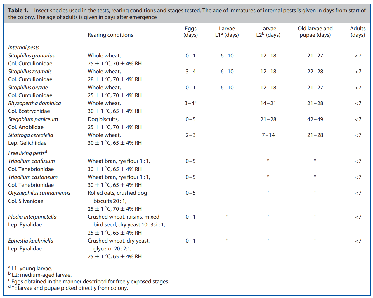 測試了一系列不同的臭氧劑量和接觸時間組合。進行了初步試點試驗,以確定外部喂食者(點間倍蠅)和內部喂食者(三種象蛉)的致死劑量和暴露時間組合(表1)。這些試驗開始時劑量非常低(10 - 20ppm,持續5天)。增加劑量和治療時間,試圖獲得所有階段的完全死亡率。