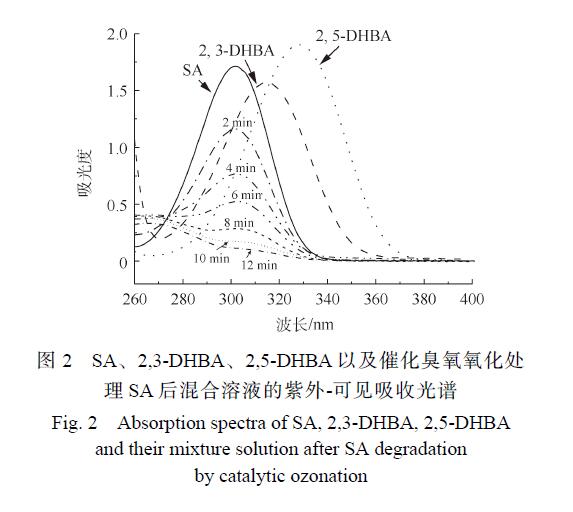 圖 2為 SA、2,3-DHBA和 2,5-BHBA的紫外-可見吸收光譜圖以及 CaO催化臭氧氧化處理后的紫外-可見吸收光譜??梢钥闯觯琒A在 302 nm處有 很大吸收峰,而 2,3-DHBA和 2,5-DHBA分別在315 nm和 330 nm處出現(xiàn) 很大吸收峰,SA經(jīng)過催化臭氧氧化處理后 很大吸收峰波長(zhǎng)向右移動(dòng),在2,3-DHBA和 2,5-DHBA的大吸收峰處有一定的吸收,證明在該過程中有 · OH產(chǎn)生。