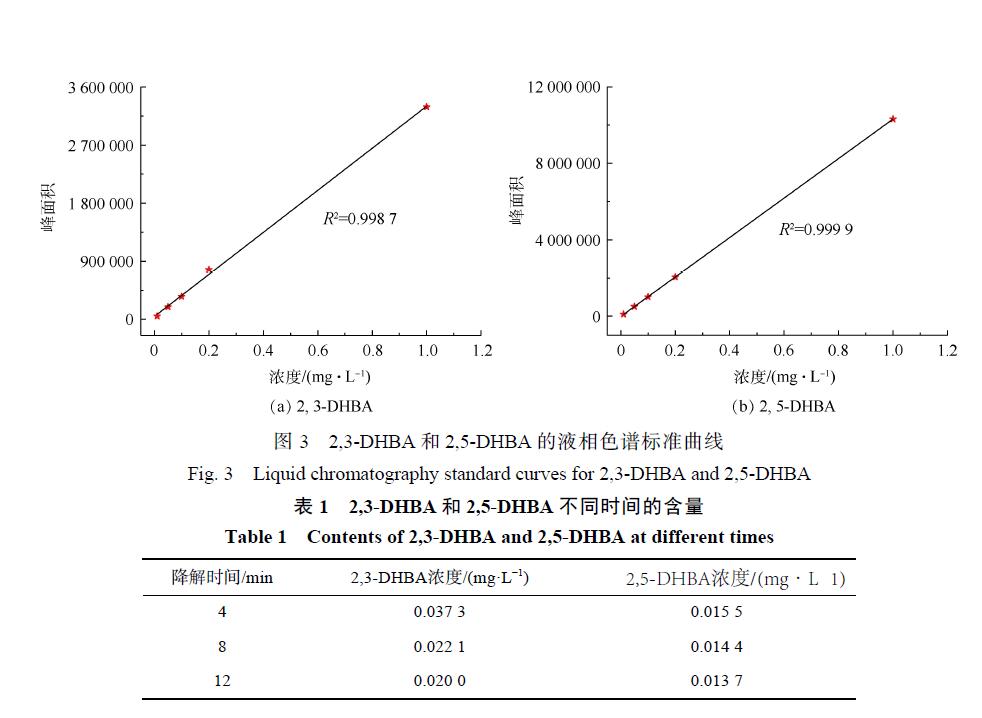 從圖2中可以觀察到2,3-DHBA和2,5-DHBA的存在,接下來使用LC-MS聯(lián)用儀對(duì)2,3-DHBA和 2,5-DHBA 的含量進(jìn)行定量分析。圖 3(a)和圖 3(b)分別表示 2,3-DHBA 和 2,5-DHBA的液相色譜標(biāo)準(zhǔn)曲線,根據(jù)該標(biāo)準(zhǔn)曲線求得 CaO催化臭 氧 處 理 不 同 時(shí) 間 溶 液 中 2,3-DHBA和 2,5-DHBA的含量,結(jié)果如表 1所示。