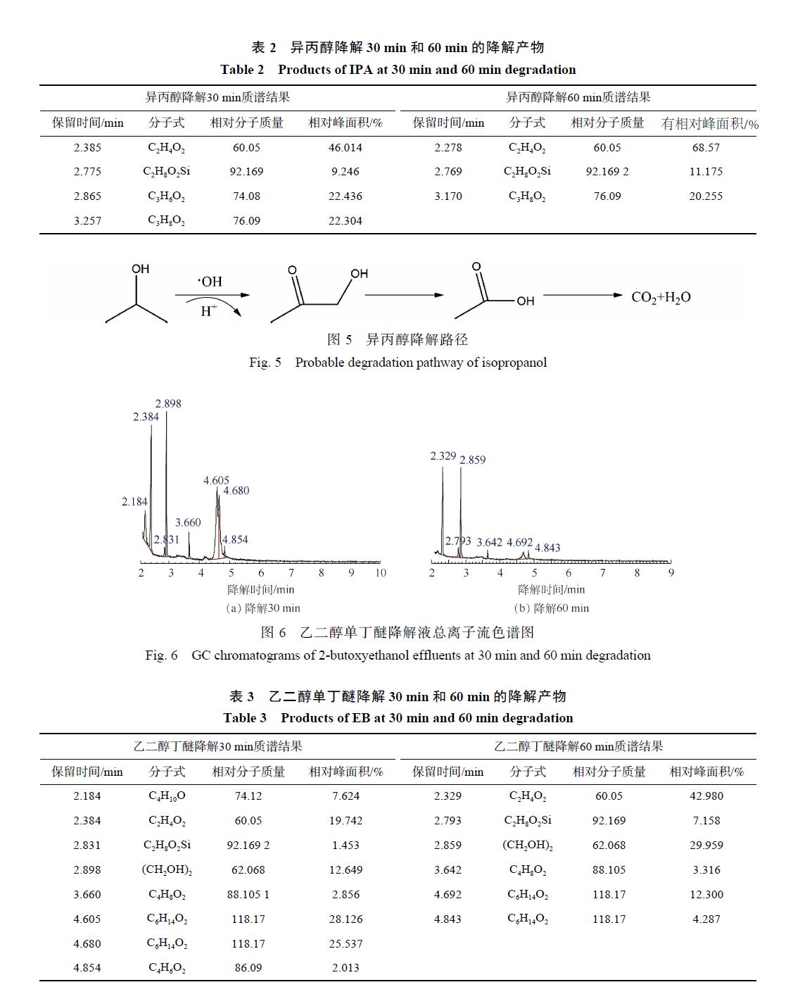 為了研究廢液的降解路徑,以廢液主要成分異丙醇和乙二醇單丁醚為例進(jìn)行探討,對(duì) 2種物質(zhì)進(jìn)行降解并對(duì)降解產(chǎn)物用GC/MS進(jìn)行檢測(cè)。