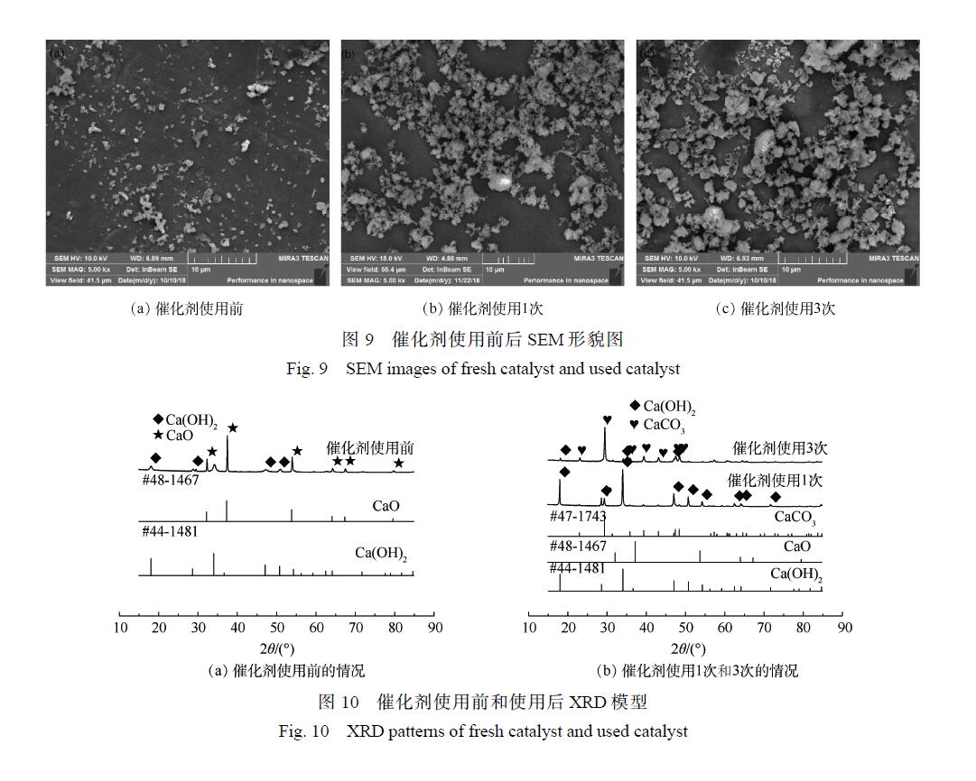 圖 10(b)為催化劑使用 1次和使用 3次后的 XRD圖。催化劑使用 1次后的 XRD譜圖在 2θ為18°、28.7°、34.1°、47.1°和 50.9°處存在較強(qiáng)的峰,這些峰與 Ca(OH)2的特征峰一致,表明其主要成分是 Ca(OH)2。而使用 3次的催化劑測(cè)出的 2θ為 23°、 29.4°、 39.4°、 43.2°和 47.1°對(duì)應(yīng)的峰 是CaCO3的特征峰,說明催化劑的失活過程主要是:經(jīng)過多次循環(huán)后的催化劑與水結(jié)合變成了Ca(OH)2,形成的 Ca(OH)2與礦化產(chǎn)物 CO2結(jié)合從而變?yōu)?CaCO3, 很終由于多次反應(yīng)后 CaCO3含量不斷增加從而導(dǎo)致催化劑催化效率逐漸降低。