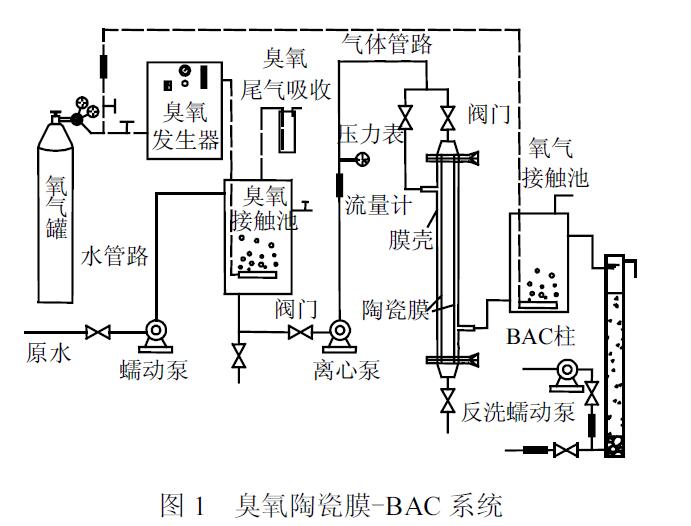 膜工藝在飲用水處理中的應(yīng)用日益增多,其對(duì)水中顆粒物有很好的分離能力,膜出水濁度一般在0.2NTU 以下,在水處理中有很大的應(yīng)用潛力.但實(shí)踐證明,膜的污染和膜工藝無(wú)法有效去除溶解性有機(jī)物和氨氮,阻礙了其廣泛應(yīng)用.陶瓷膜具有機(jī)械強(qiáng)度高、化學(xué)穩(wěn)定性和熱穩(wěn)定性高等優(yōu)點(diǎn).陶瓷膜能夠與臭氧直接接觸,可有效控制膜污染.臭氧氧化在控制膜污染的同時(shí)還能降低有機(jī)物的分子量,提高其可生化性.但有報(bào)道指出,臭氧氧化可降低膜對(duì)的有機(jī)物的去除效果.為提高膜對(duì)有機(jī)物的去除,通常在膜工藝前設(shè)置粉末活性炭或顆粒活性炭等預(yù)處理工藝.預(yù)處理工藝能夠改變水中顆粒物和有機(jī)物的賦存形態(tài),降低膜的有機(jī)物負(fù)荷,減輕膜污染,提高有機(jī)物的去除效果.但此類預(yù)處理工藝多利用了活性炭的吸附作用,且對(duì)氨氮的去除無(wú)顯著改善.研究表明,生物活性碳(BAC)可有效去除水中的有機(jī)物和氨氮.因此,在臭氧-陶瓷膜后設(shè)置BAC工藝,形成臭氧陶瓷膜-BAC組合工藝,可在臭氧控制膜污染的基礎(chǔ)上去除有機(jī)物和氨氮,能夠一舉兩得.