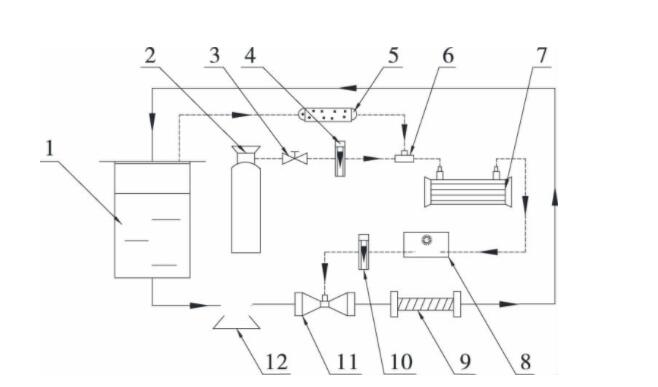 1. 儲(chǔ)液罐 2. 氧氣瓶 3. 減壓閥 4、10. 流量計(jì) 5. 干燥管 6. 三通閥 7. 臭氧發(fā)生器 8. 調(diào)節(jié)氣泵 9. 靜態(tài)混合器 11. 射流器 12. 離心泵