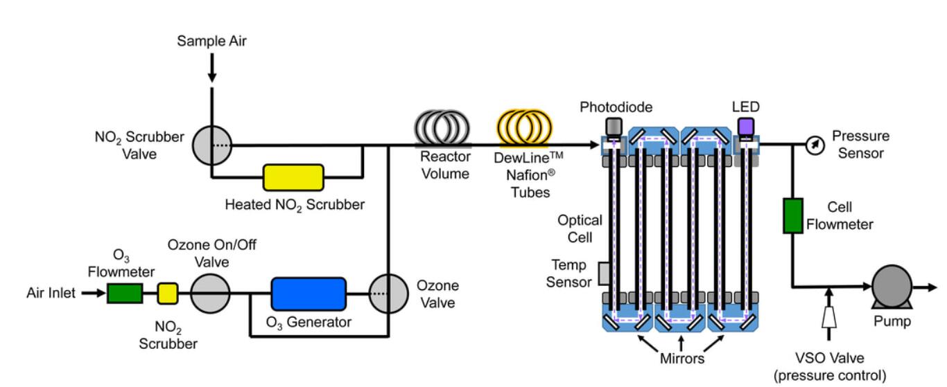 下圖是 美國2B 405 nm NO x 型監(jiān)視器的簡化示意圖。樣品空氣由氣泵以~1.5 L/min的流速連續(xù)吸入儀器。洗滌器閥交替旁路并通過 NO 2 洗滌器發(fā)送樣品空氣以去除樣品中的所有 NO 2,從而允許在沒有 NO 2 的 (I o) 和存在 (I) 的 NO2 的情況下測量光強(qiáng)度。然后使用比爾-朗伯定律計(jì)算 I和 Io 的 NO 2 濃度。