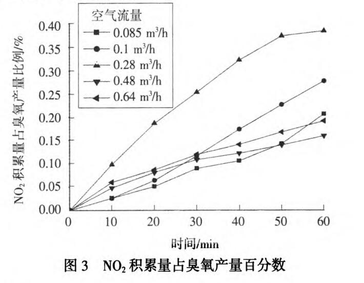 (2)空氣流量為0.48 m3/h時,該臭氧發生器的效果達到很佳,1 h內NO2積累量占臭氧產量的百分數很低(0.160%),明顯優于家用臭氧機(0.207%)。通過對家用臭氧機的結構進行改進,采用平面放電方式,改善了電場分布均勻度,降低電壓,減少能量消耗,降低發熱量,臭氧發生器對副產物NO2產量的控制達到了一-定效果,但改進方法仍不夠完善,有待進-步研究。
