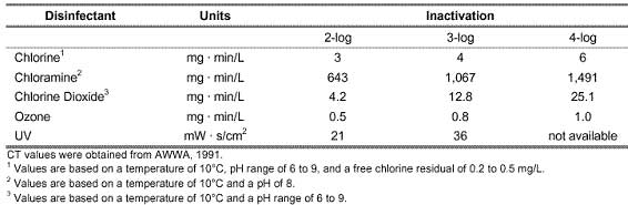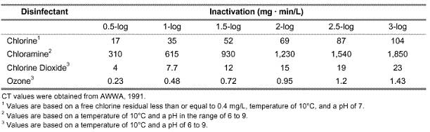原生動物隱孢子蟲很難被氯和氯胺滅活。對于1-log失活(= 90%失活),氯失活的Ct值在3000和4000mg min / L之間變化。兩個(gè)表都來自環(huán)境保護(hù)局(EPA)。