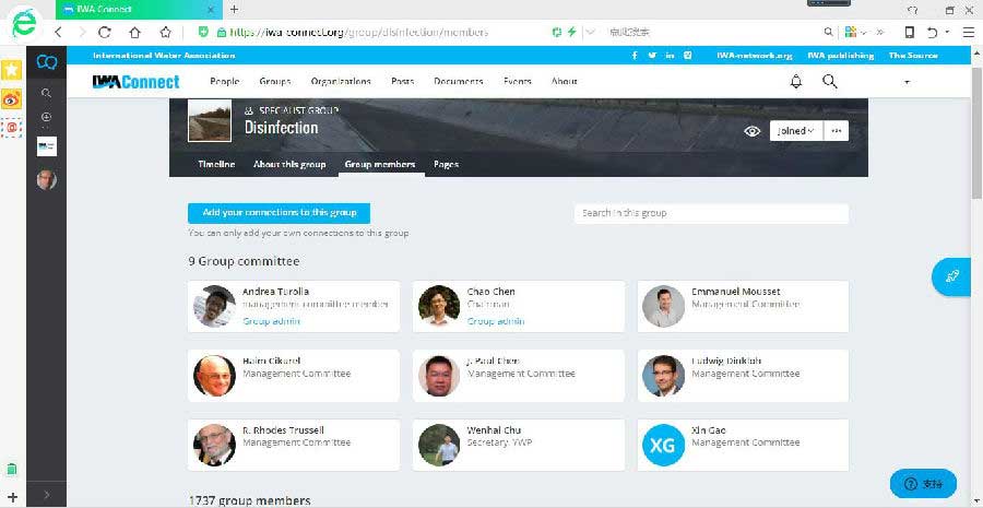 消毒專業委員會是IWA第一批專業委員會之一,現有1700多名會員,其管理委員會主要負責組織IWA在水處理消毒領域的學術活動。該專業委員會的學術活動與聯合國第6項可持續發展目標(Sustainable Development Goal 6: Clean Water and Sanitation)高度相關。主要研究和工作內容包括:(1)水處理消毒藥劑、設備和工藝開發,(2)微生物消毒滅活及其抗性機理,(3)消毒副產物及其前體物,(4)消毒與管網水質穩定性,(5)消毒與公共衛生。國際水協會消毒委員會計劃每2年舉行一次國際消毒相關學術會議。2018年5月14日至18日,第二屆國際水協會消毒與消毒副產物研討會(2018 IWA Disinfection & Disinfection By-Products conference)在中國北京舉行,清華大學環境學院劉文君教授擔任大會主席、陳超副研究員擔任大會組委會主席。